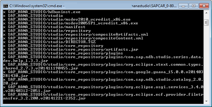 Dal folder dove avete scaricato il SAR file di HANA studio e il SAPCAR.EXE, eseguite il comando seguente: